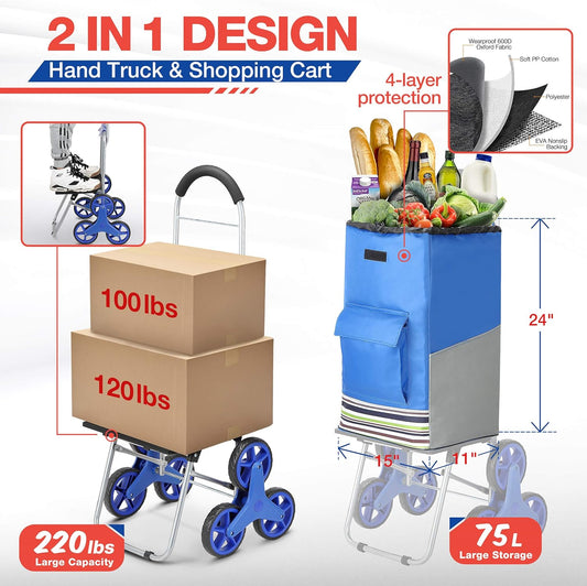 Shopping Cart, Super Loading Stair Climber Cart 220 lbs Capacity Grocery Foldable Cart with Extra Large Shopping Bag Laundry Utility Cart with Adjustable Bungee Cord